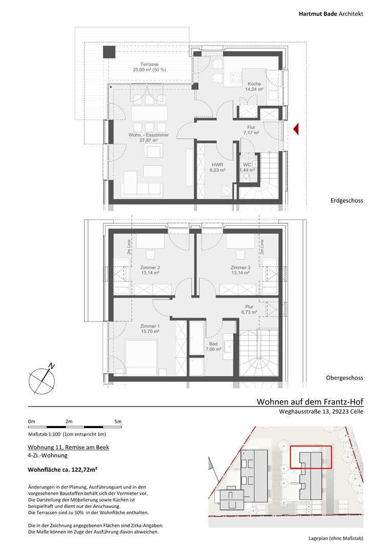 Die Wohnung bietet als Vierzimmerwohnung den Wohnkomfort eines Einfamilienhauses mit separatem Eingang und eigener Hausnummer. Der Eingang von der Bachseite im Nordosten erschließt das Haus. Von hier hat man einen herrlichen Blick über die Wiesen und Felder. Dem Flur schließen sich ein Gäste - WC und ein Hauswirtschaftsraum an. In südwestlicher Ausrichtung befinden sich, lichtdurchflutet durch große bodentiefe Fensterelemte, der Wohn- und Essbereich. Die Küche schließt sich dem Esszimmer an. Ebenfalls in südwestlicher Ausrichtung befindet sich die überdachte Terrasse mit einem sich anschließenden eigenen Gartenbereich. Im Obergeschoss befinden sich neben einem Badezimmer mit Dusche und Badewanne drei weitere Räume. Der komplett ausgebaute Dachboden kann als zusätzlicher Abstellraum genutzt werden.